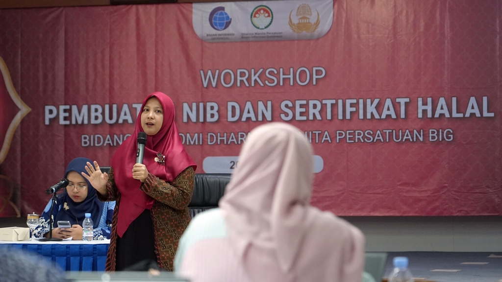 Lusi Yenanda (kerudung merah) tengah menjelaskan tentang program OSS dan Sehati kepada peseta workshop Pembuatan NIB dan Sertifikat Halal di BIG pada 20 Juni 2025. dok.BIG / Tommy Nautico