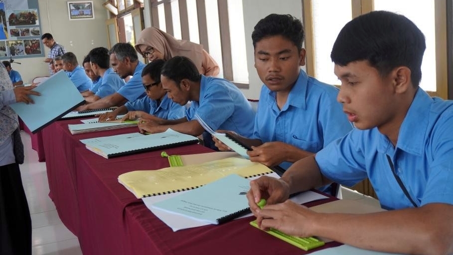 Peserta Menuliskan Jawaban Soal Uji Pemaknaan dan Pembinaan Atlas Taktual Indonesia Wilayah Provinsi Jawa Tengah Menggunakan Reglet (dok: Nastiti DAPIG-BIG)