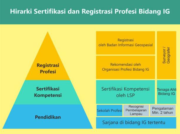 Sedangkan, untuk menjadi seorang ahli, harus mempunyai pendidikan akademik jenjang sarjana. Bisa digambarkan dalam skema sederhana, pondasi dari pelaksana bidang IG adalah pendidikan, kemudian kompetensi, dan di atasnya adalah profesi sebagaimana gambar terlampir.