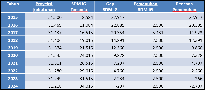 Pada tabel di atas, terlihat gap SDM IG dari 2015-2023 mengalami defisit pemenuhan. Jumlah yang dibutuhkan lebih banyak dari pada yang tersedia di lapangan.