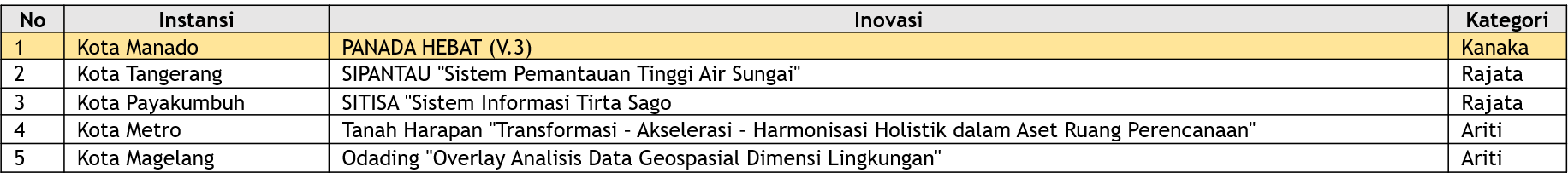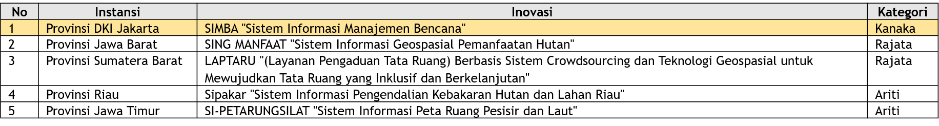 Seluruh usulan inovasi tersebut diseleksi oleh tim juri yang terdiri dari unsur internal BIG, akademisi (UGM, ITB, UI, UB), perwakilan pemerintah pusat (Bappenas dan KemenPANRB), serta profesional di bidang informasi geospasial. Dari proses penilaian yang ketat, juri menetapkan lima finalis pada setiap kategori sebelum menentukan pemenang.