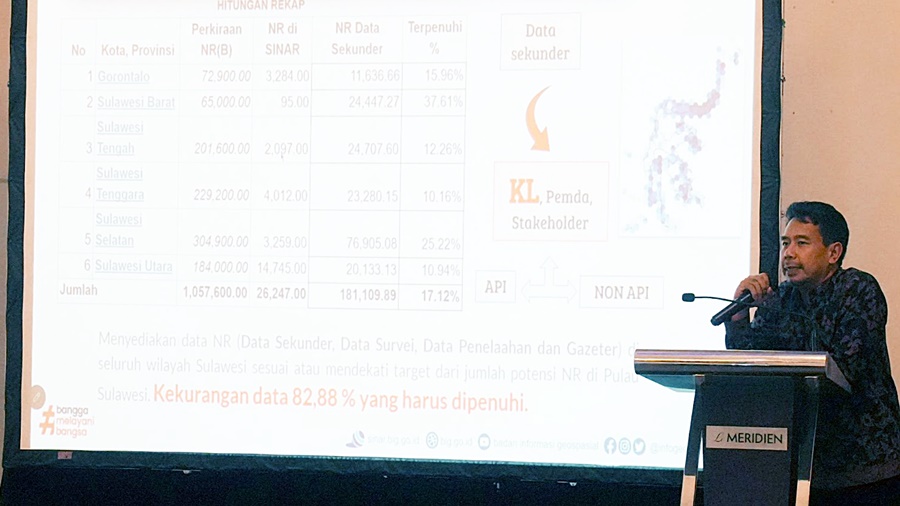 Menurut Ade, saat ini kebutuhan data nama rupabumi (NR) di Sulawesi baru tercapai 17,12 persen dari total estimasi. Data NR yang sudah terkumpul berasal dari berbagai sumber data, seperti data sekunder, Peta Rupabumi Indonesia (RBI), dan Sistem Informasi Nama Rupabumi (Sinar). Khusus untuk data dari Sinar, berasal dari berbagai status data, yaitu data survei, penelaahan kabupaten/kota, penelaahan provinsi, penelaahan pusat, dan data gazetir.