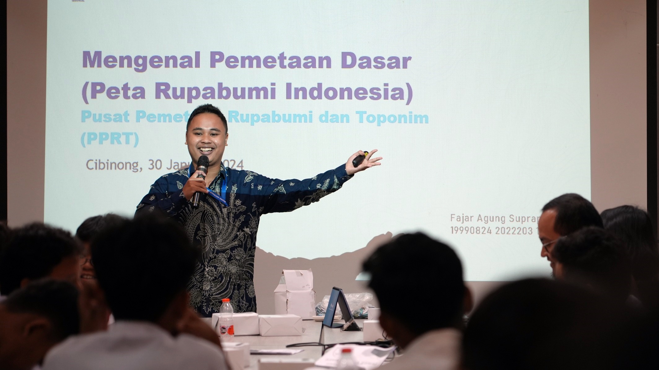 Selanjutnya, Fajar Agung Suprapto dari Pusat Pemetaan Rupabumi dan Toponim (PPRT) BIG mempresentasikan materi mengenai pemetaan dasar.