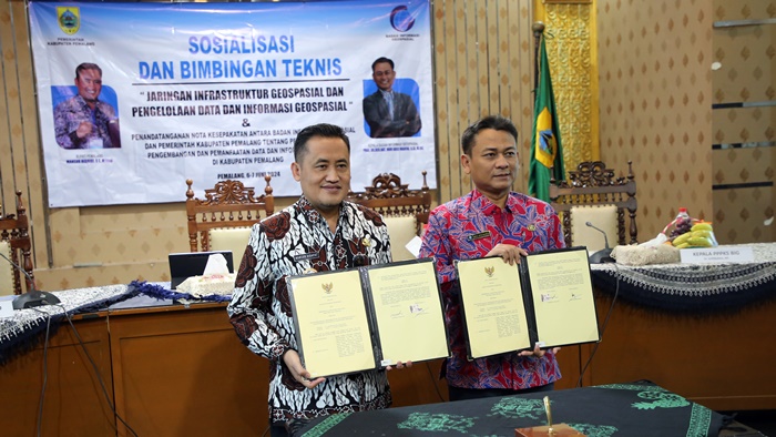 Pemalang, Berita Geospasial – Badan Informasi Geospasial (BIG) dan Pemerintah Kabupaten Pemalang melakukan penandatanganan Nota Kesepakatan tentang Penyelenggaraan, Pengembangan, dan Pemanfaatan Data dan Informasi Geospasial di Kantor Bupati Pemalang pada Kamis, 6 Juni 2024. Nota Kesepakatan ditandatangani oleh Kepala BIG Muh Aris Marfai dan Bupati Pemalang Mansur Hidayat.