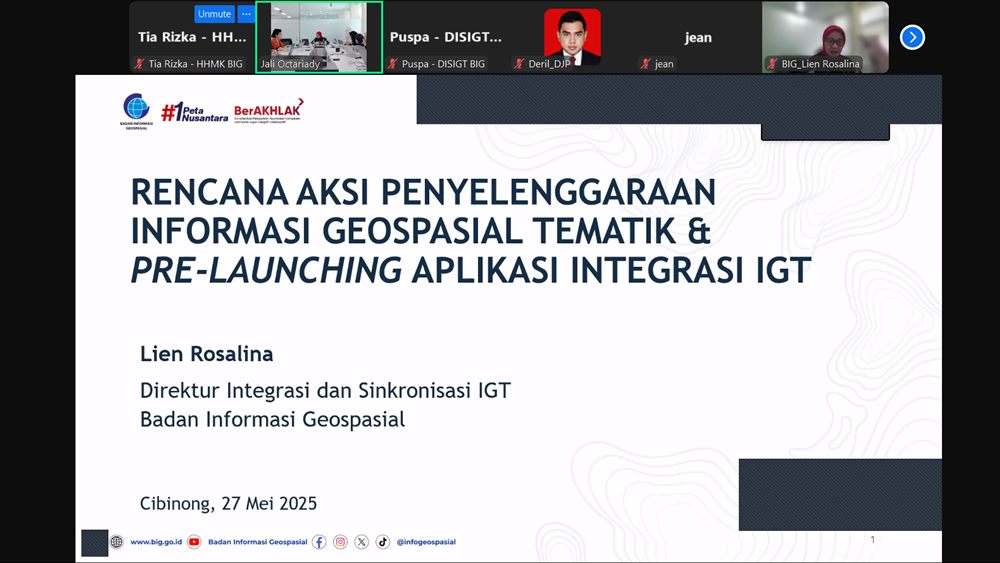 Cibinong, Berita Geospasial — Badan Informasi Geospasial (BIG) menggelar pre-launching `Aplikasi Integrasi Informasi Geospasial Tematik (IGT)` secara daring pada Selasa, 27 Mei 2025. Kegiatan ini menjadi bagian dari pengembangan Geoportal Kebijakan Satu Peta (KSP) 2.0 dan diikuti lebih dari 300 peserta dari berbagai kementerian dan lembaga.