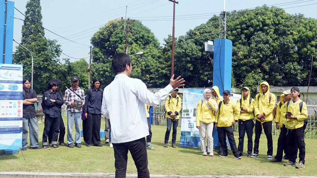 Andhika Prastyadi Nugroho (kemeja putih), ASN Direktorat Sistem Referensi Geospasial sedang menjelaskan tentang stasiun pasang surut kepada mahasiswa Unpak. dok.BIG/Farhani Fazidah