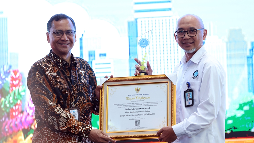 Penghargaan bergengsi ini diberikan oleh Arsip Nasional Republik Indonesia (ANRI) dalam acara Penganugerahan Simpul Jaringan Terbaik Nasional 2025 yang digelar di Ruang Noerhadi Magetsari, ANRI pada Kamis, 26 Juni 2025. Penghargaan diserahkan langsung oleh Kepala ANRI Mego Pinandito kepada Kepala Biro Umum dan Keuangan BIG Tito Setiawan, selaku Kepala Unit Kearsipan BIG.