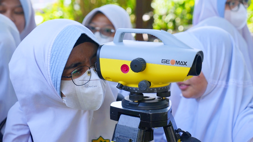 Siswa MA Daarul Ilmi Depok sedang mencoba alat survey yaitu waterpas digial untuk melakukan pengukuran ketinggian atau perataan (levelling) dengan akurasi tinggi secara cepat dan mudah. dok.BIG/Edwin Rico