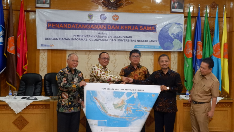Jambi, Berita Geospasial - Badan Informasi Geospasial menjalin kerja sama dengan Pemerintah Kabupaten Batanghari. Penandatanganan dokumen kerja sama dilaksanakan pada Selasa (18/2) di Ruang Senat Universittas Jambi. Pada kegiatan tersebut hadir Bupati Batanghari Syahirsah, Plt Kepala Pusat Penelitian, Promosi, dan Kerja Sama BIG Sumarsono, Rektor Universitas Jambi Sutrisno, Dekan Fakultas Teknik M.Naswir, dan Asisten 1 Sekda Provinsi Jambi Pani Saharudin.