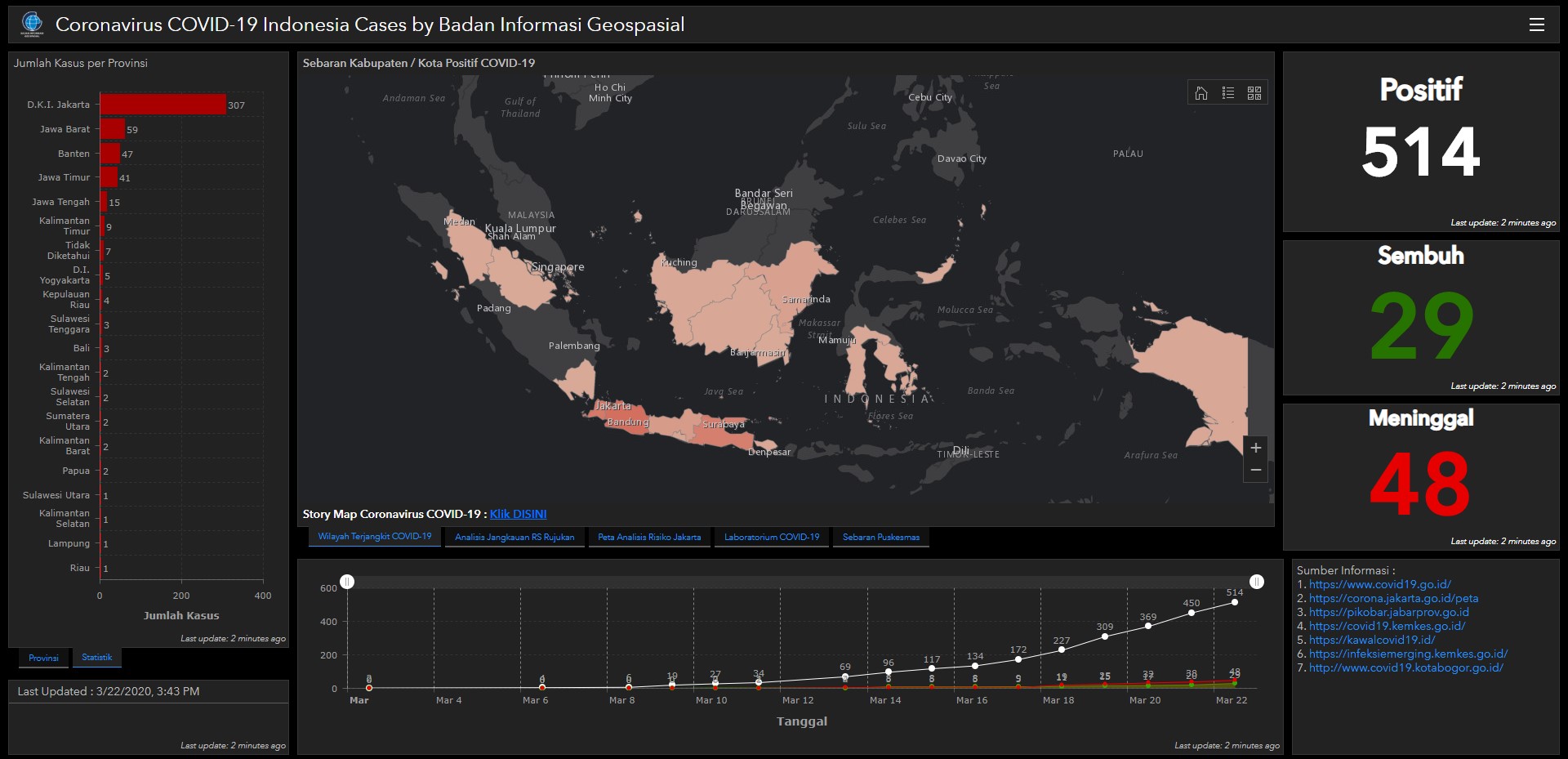 Sebagai upaya untuk mendukung pencegahan Covid-19, Badan Informasi Geospasial merilis Peta Sebaran Covid-19. Melalui peta tersebut, pengguna dapat memantau wilayah sebaran Covid-19, memantau grafik kasus Covid-19, sekaligus mengetahui analisis spasial atas persebaran Covid-19 di wilayah tertentu. Peta Sebaran Covid-19 akan terus dimutakhirkan seiring dengan perkembangan kasus Covid-19 dan ketersediaan data mutakhir.