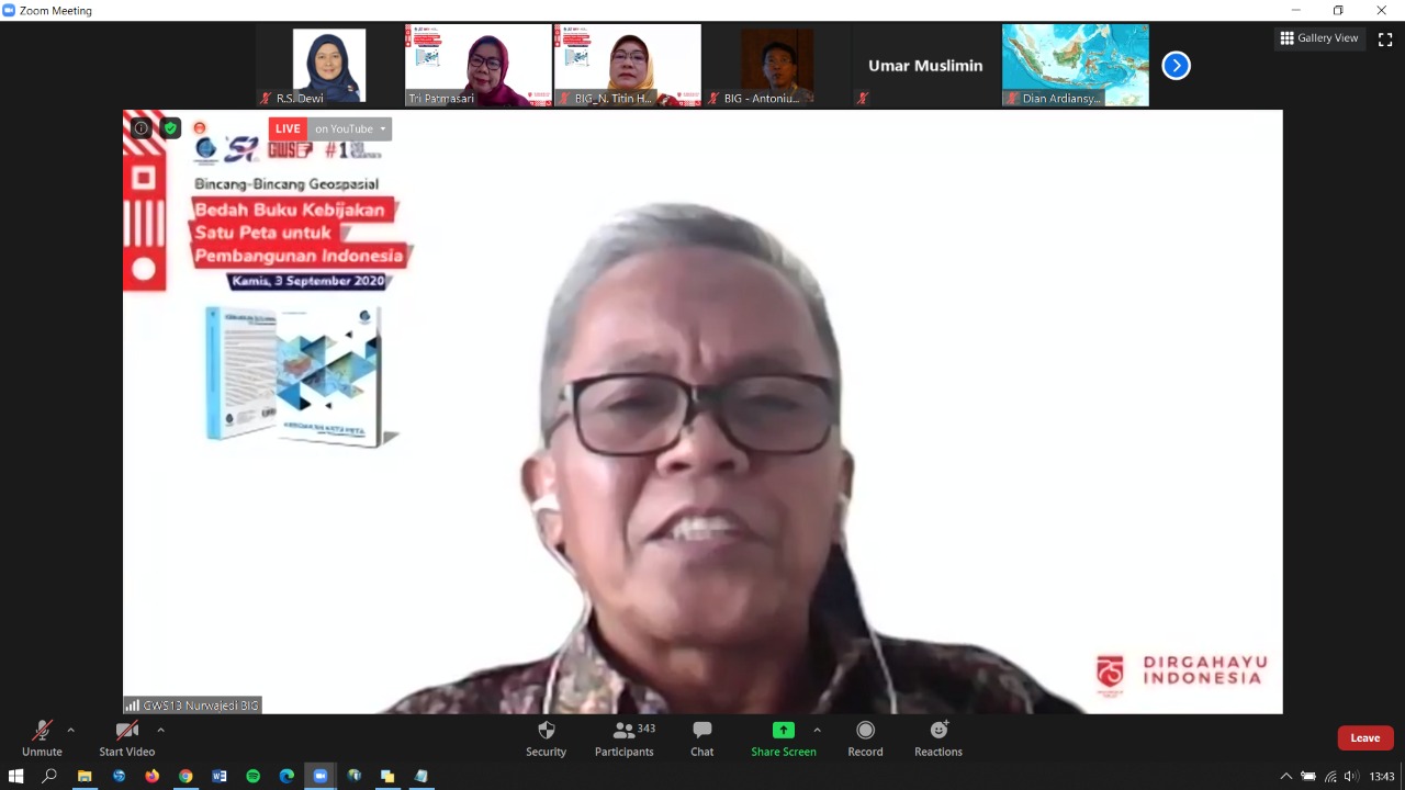 Pernyataan tersebut disampaikan Deputi Bidang Informasi Geospasial Tematik BIG Antonius Bambang Wijanarto saat membuka Geospasial Webinar Series dengan tema Bedah Buku “Kebijakan Satu Peta (KSP) untuk Pembangunan Nasional”, Kamis, 3 September 2020.