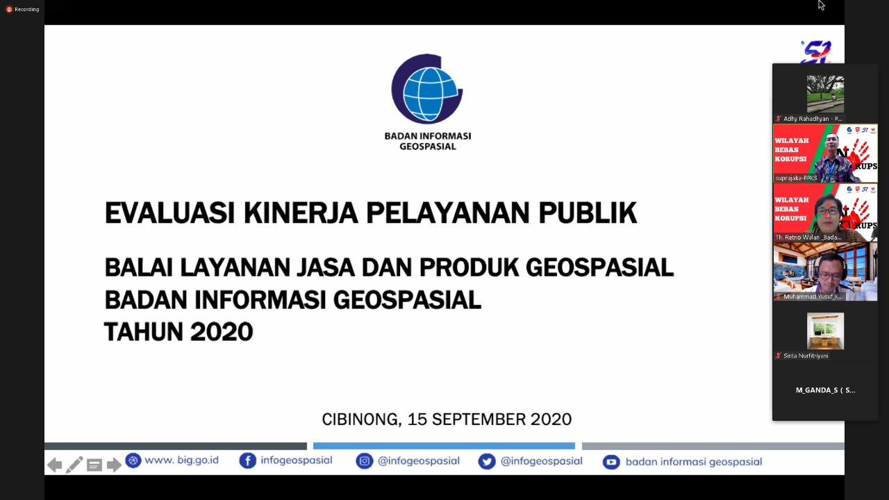 Badan Informasi Geospasial (BIG) termasuk kedalam lembaga yang sedang melakukan percepatan peningkatan kualitas, hal itu tercermin dalam kegiatan Evaluasi Pelayanan Publik BIG Tahun 2020 yang dilaksanakan Selasa (15/09).