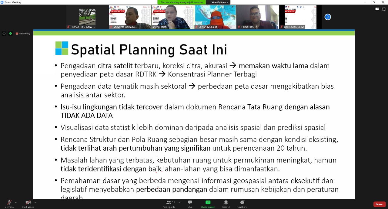 “Saat ini spasial planning memiliki berbagai macam tantangan salah satunya terkait pengadaan citra satelit terbaru serta koreksi citra dan akurasi, sehingga membuat konsentrasi planner terbagi” ungkapnya.