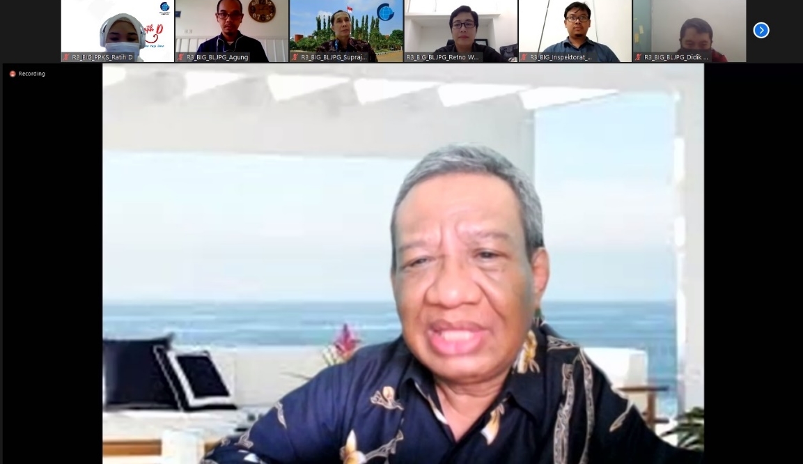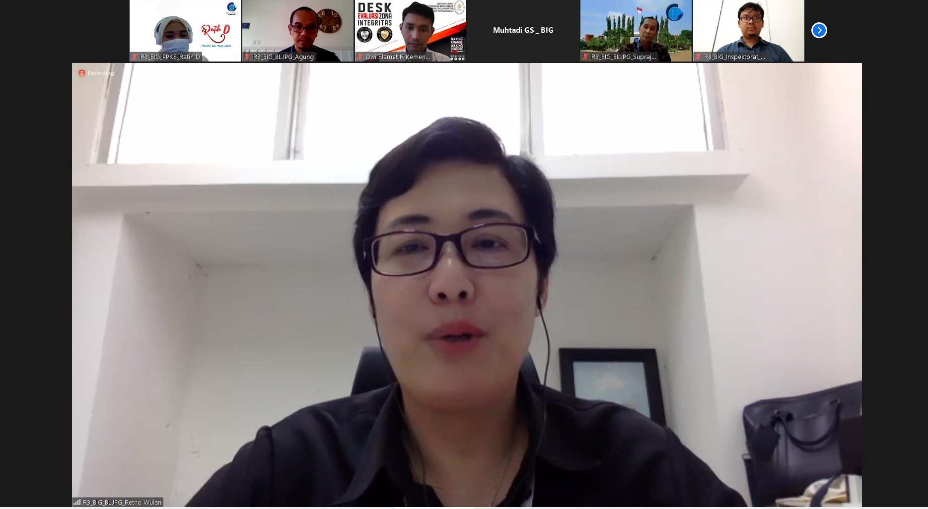 Cibinong, Berita Geospasial – Badan Informasi Geospasial (BIG) melaksanakan evaluasi pembangunan Zona Integritas (ZI) menuju Wilayah Bebas dari Korupsi/Wilayah Birokrasi Bersih dan Melayani (WBK/WBBM). Sebagai upaya pencegahan penularan COVID-19, evaluasi oleh Kedeputian Reformasi Birokrasi, Akuntabilitas Aparatur, dan Pengawasan Kementerian Pendayagunaan Aparatur dan Reformasi Birokrasi (Kemenpan-RB) dilakukan secara daring melalui konferensi video.