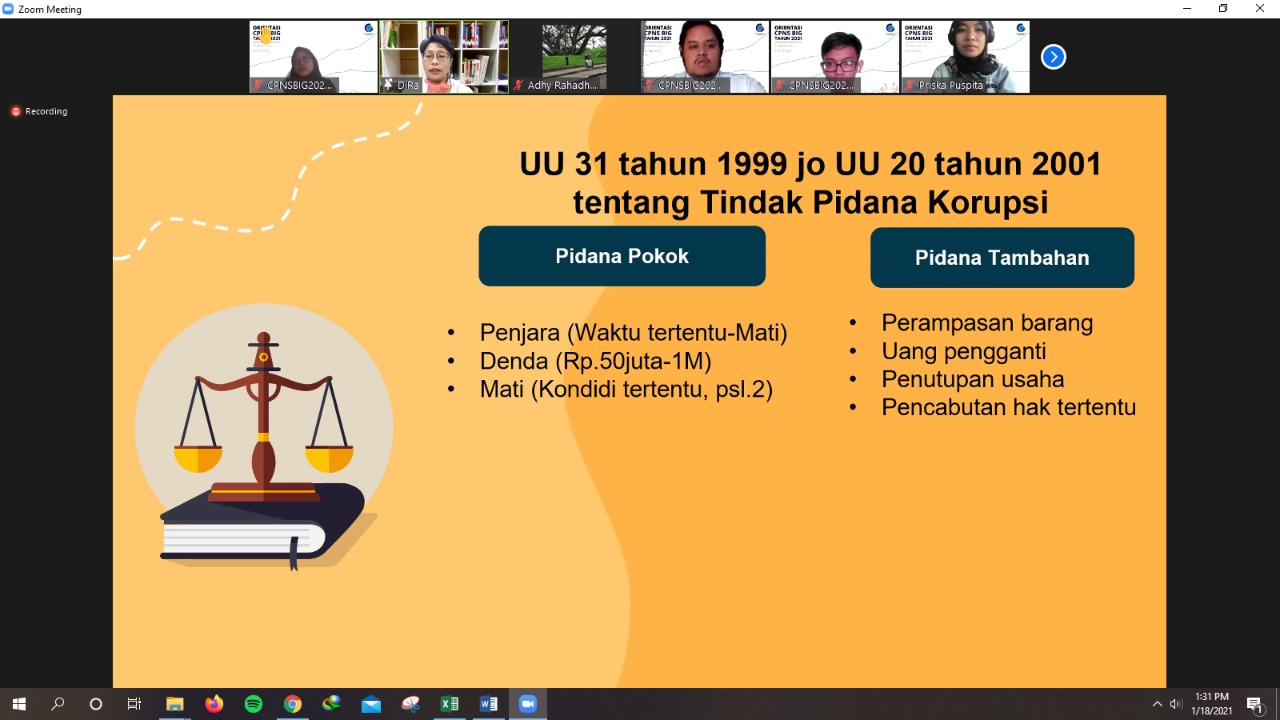 "Tindakan korupsi dan juga perilaku koruptif melupakan salah satu hal yang harus kita perangi, agar cita-cita menjadi bangsa yang maju dapat segera tercapai," ungkap ketua Satgas Kampanye Antikorupsi Komisi Pemberantasan Korupsi (KPK) Dian Rahmawati saat memberikan paparan pada Orientasi Calon Pegawai Negeri Sipil Badan Informasi Geospasial (CPNS BIG) pada Senin, 18 Januari 2021.