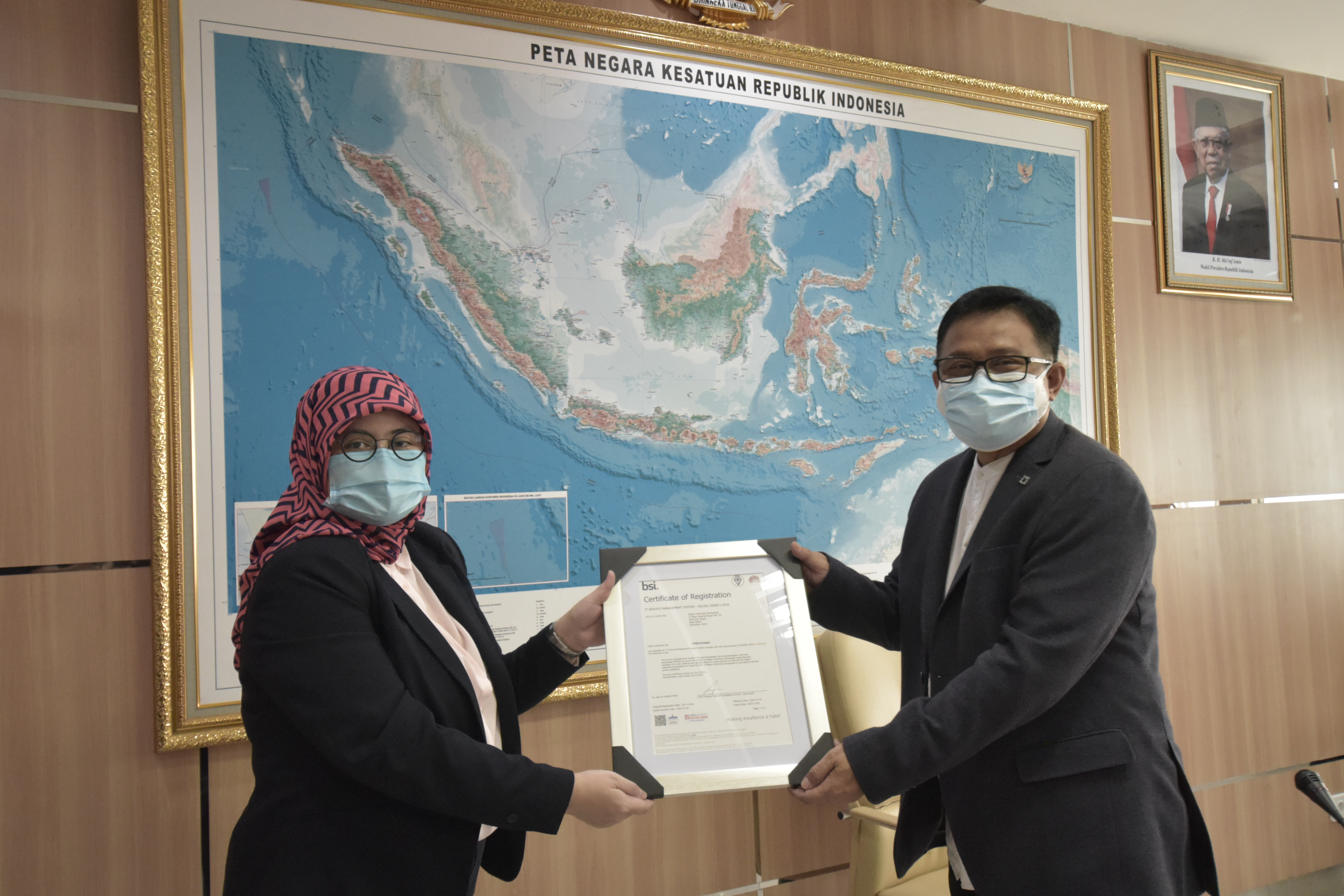 Sertifikat ISO diserahkan oleh Business Strategy Manager BSI Sherly Maharani kepada Deputi Bidang Infrastruktur Informasi Geospasial Adi Rusmanto di kantor BIG, Cibinong, 8 Februari 2021.