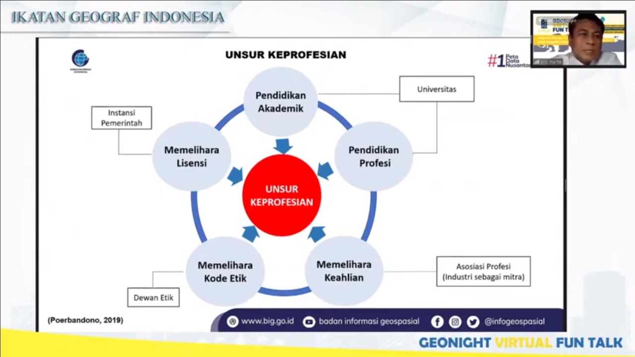 Lebih jauh, menurut Aris, dengan munculnya Peraturan Pemerintah No.45 Tahun 2021 tentang Penyelenggaraan Informasi Geospasial, muncul wacana mengenai profesi geografer. Untuk itu, Aris meminta pemangku kepentingan yang terkait bidang geografi untuk bersiap. Ia menjelaskan lima unsur yang diperlukan untuk menghidupkan profesi geografer yaitu pendidikan akademik, pendidikan profesi, pemeliharaan keahlian, pemeliharaan kode etik, dan pemeliharaan lisensi.