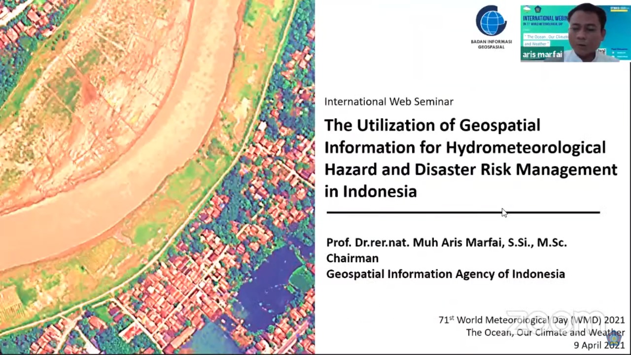 Kepala BIG Muh Aris Marfai menjadi pembicara utama pada International Webinar World Meteorology Day 2021 yang diadakan Sekolah Tinggi Meteorologi Klimatologi dan Geofisika (STMKG) pada Jumat, 9 April 2021. Pada rangkaian acara peringatan Hari Meteorologi Internasional ke-71 ini, ia memaparkan peran penting informasi dan data ruang kebumian (geospasial) dalam pencegahan serta penanganan bencana.