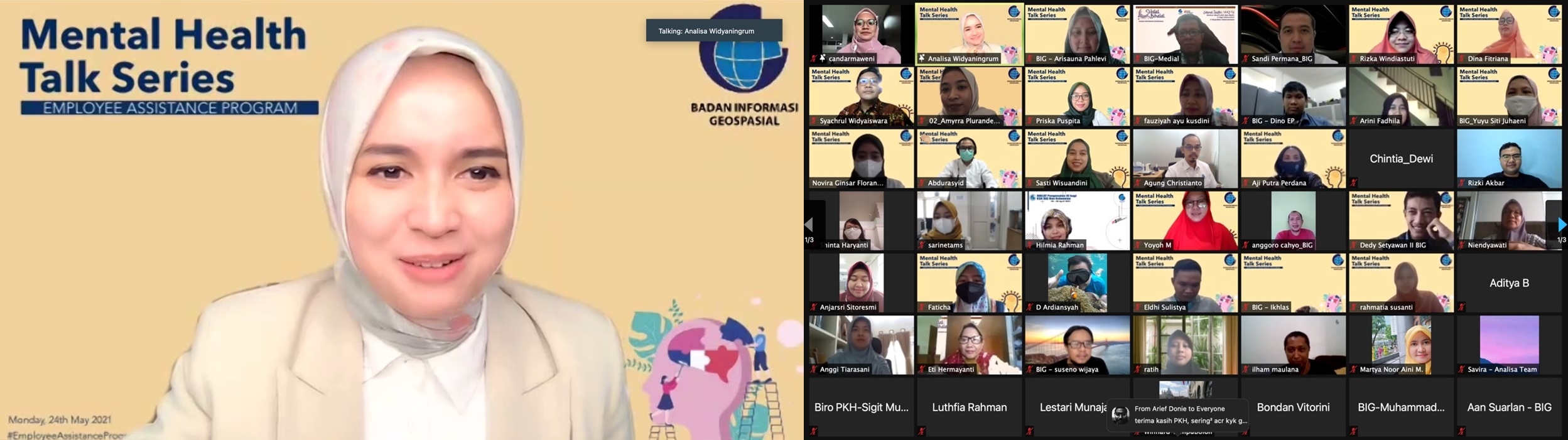 Cibinong, Berita Geospasial – Badan Informasi Geospasial (BIG) menyelenggarakan talkshow bertajuk `Mental Health` sebagai bagian dari Employee Assistance Program (EAP). EAP adalah program untuk membantu pegawai dalam mengatasi masalah pribadi mereka, terutama di masa pandemi COVID-19 yang serba tidak stabil ini.