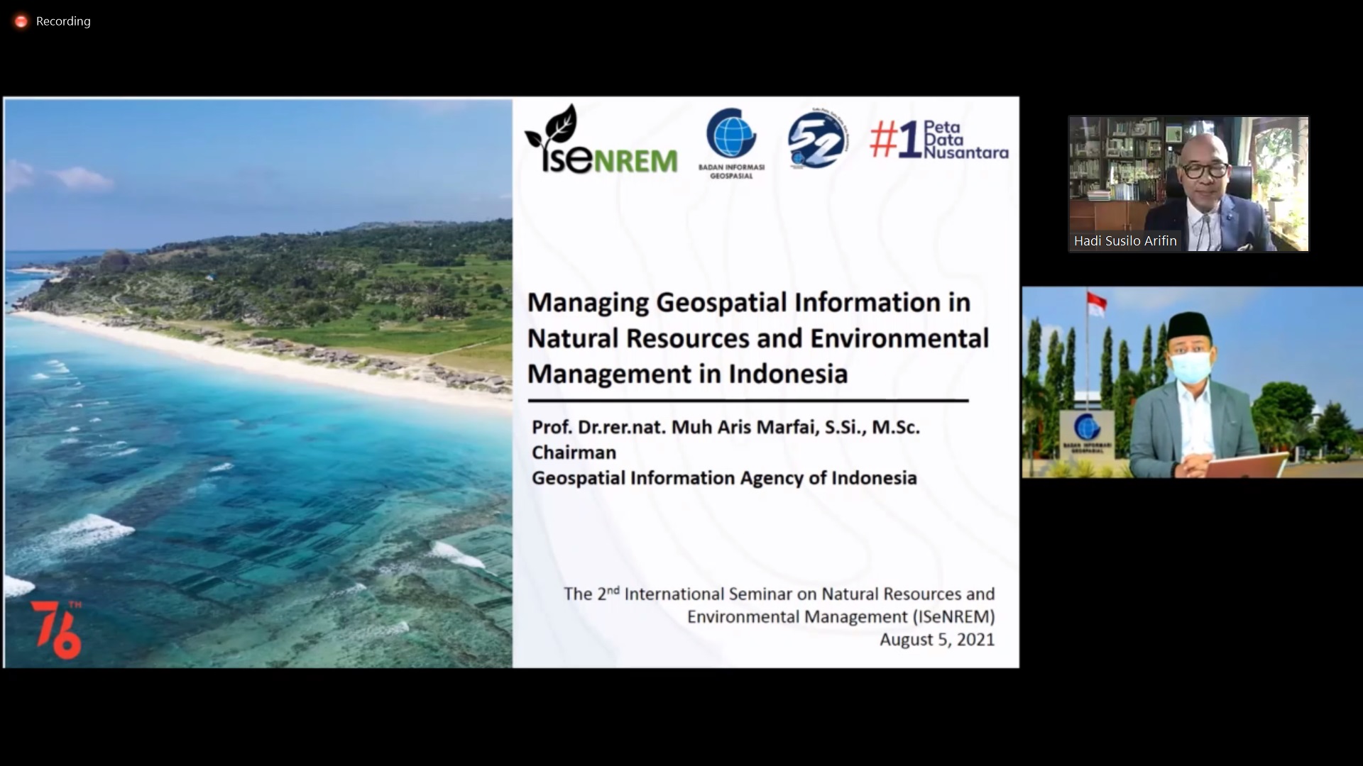 Cibinong, Berita Geospasial – Mengulang kisah sukses di tahun 2019, tahun ini kembali digelar “The 2nd International Seminar on Natural Resources and Environmental Management (ISeNREM)”. Acara ini mengusung tema “Towards a New Era of Natural Resources and Environtmental Management”. Acara dilaksanakan secara daring melalui platform zoom meeting pada tanggal 4-5 Agustus 2021.