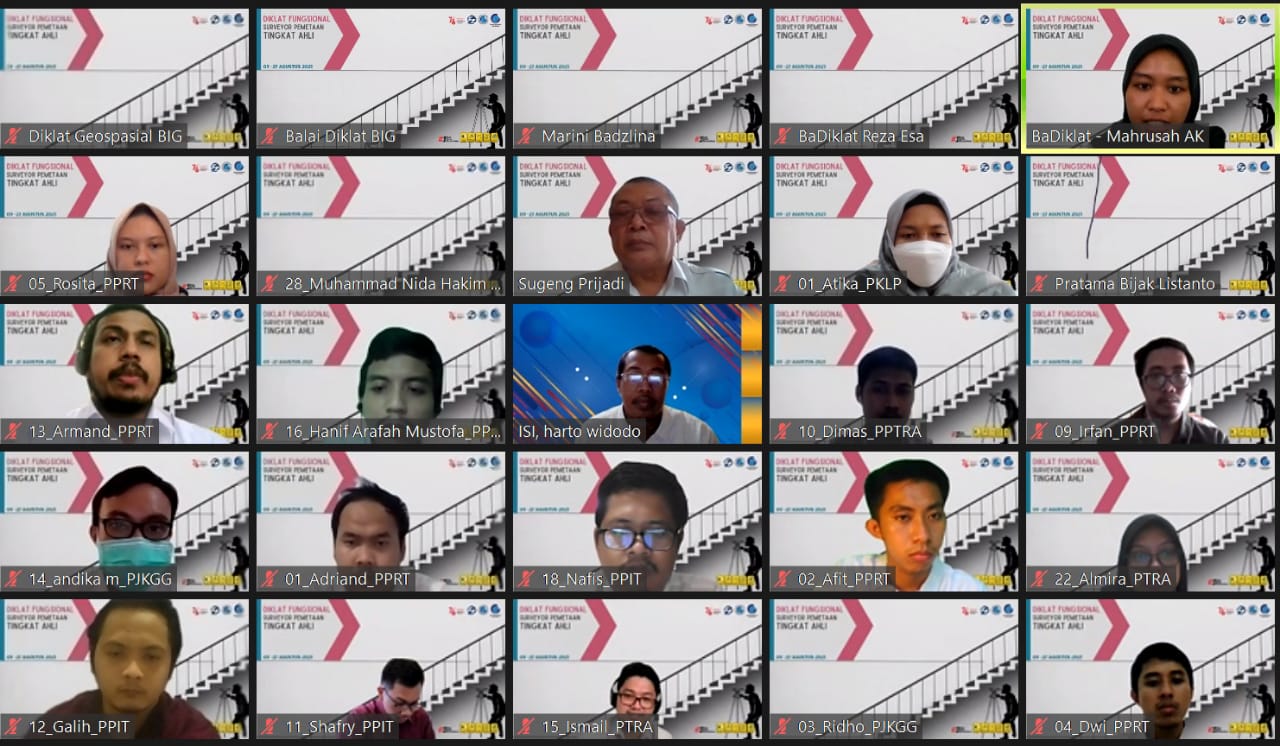 Cibinong, Berita Geospasial - Sebanyak 31 calon pegawai negeri sipil (CPNS) formasi jabatan fungsional surveyor pemetaan (surta) mengikuti Pendidikan dan Pelatihan (Diklat) Fungsional Surveyor Pemetaan tingkat Ahli yang dilaksanakan di Balai Pendidikan dan Pelatihan Geospasial BIG.Diklat fungsional ini dilaksanakan mulai tanggal 9 hingga 27 Agustus 2021 menggunakan sistem pembelajaran jarak jauh/daring melalui aplikasi LMS Geospasial dan zoom.