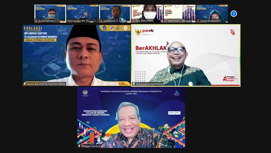 Cibinong, Berita Geospasial - Rangkaian evaluasi Sistem Akuntabilitas Kinerja Instansi Pemeritah (SAKIP), Reformasi Birokrasi (RB) tahun 2021 yang dilaksanakan oleh Kementerian Pendayagunaan Aparatur Negara dan Reformasi Birokrasi (KemenPANRB) memasuki fase akhir. Badan Informasi Geospasial (BIG) sebagai salah satu lembaga yang dinilai menjalani evaluasi atas implementasi SAKIP da pelaksanaan RB secara daring melalui media zoom meeting pada Kamis, 16 September 2021. Acara tersebut dihadiri secara daring oleh Kepala BIG, Sekretaris Utama BIG, Pejabat Tinggi Madya, Pejabat Tinggi Pratama, serta tim RB BIG yang tersebar pada unit-unit teknis di lingkungan BIG, juga tim evaluator dari KemenPANRB.