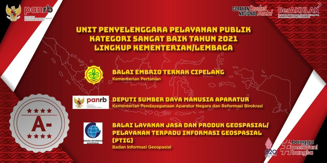 Cibinong, Berita Geospasial – Badan Informasi Geospasial (BIG) kembali meraih predikat Unit Penyelenggara Pelayanan Publik Kategori Sangat Baik Lingkup Kementerian/Lembaga dari Kementerian Pendayagunaan Aparatur Negara dan Reformasi Birokrasi (KemenpanRB). Predikat ini merupakan penghargaan yang tiga kali berturut-turut dicapai BIG sejak tahun 2019.