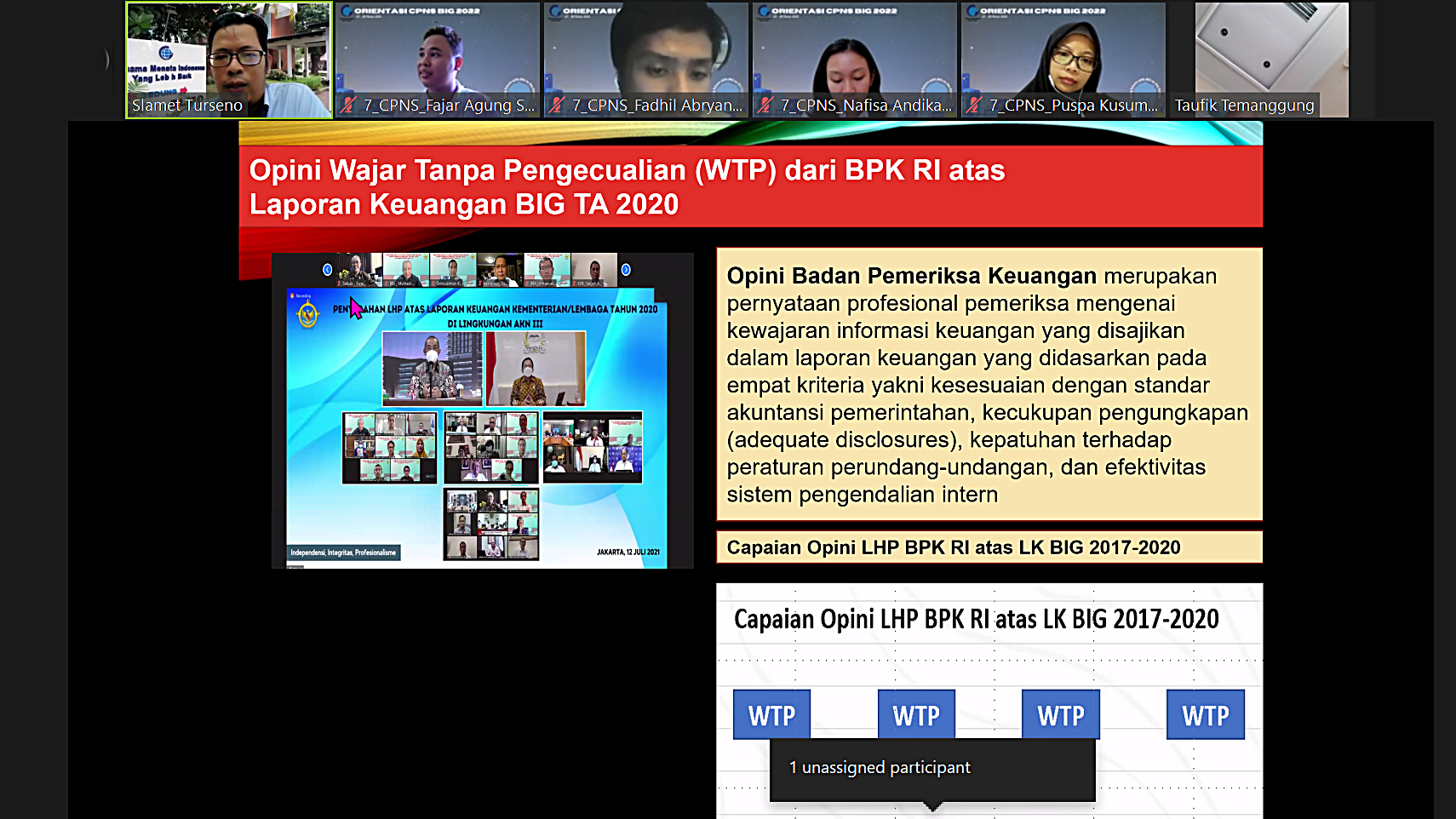 Cibinong, Berita Geospasial – Melanjutkan rangkaian Orientasi Calon Pegawai Negeri Sipil (CPNS) Badan Informasi Geospasial (BIG), para peserta berkenalan dengan Biro Umum dan Keuangan (Biro UK). Koordinator Keuangan BIG Taufik Hidayatullah menyambut hangat CPNS BIG dalam pertemuan secara daring pada Rabu, 16 Maret 2022.