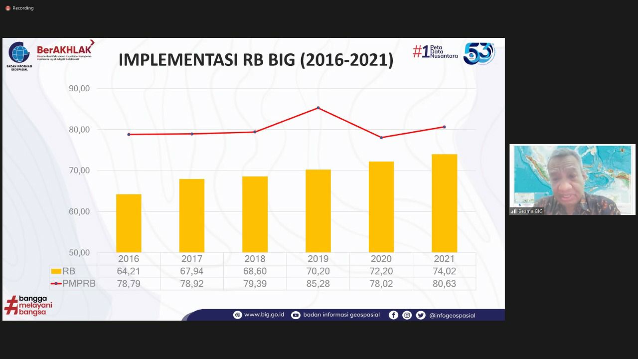 Sementara itu, Sekretaris Utama BIG Muhtadi Ganda Sutrisna menyampaikan nilai RB BIG meningkat dari angka 72,20 di tahun 2020 menjadi 74,02 pada tahun 2021. “Kita harus yakin nilai RB akan menjadi lebih baik dari waktu ke waktu,” tutur Ganda.