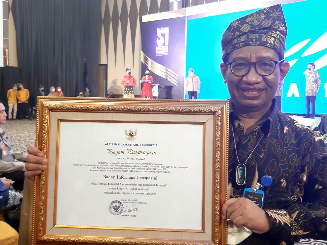 Penghargaan diserahkan langsung oleh Menteri Pendayagunaan Aparatur Negara dan Reformasi Birokrasi (PANRB), Tjahjo Kumolo dan Kepala ANRI, Imam Gunarto kepada Sekretaris Utama BIG, Muhtadi Ganda Sutrisna pada kegiatan Anugerah Kearsipan pada peringatan Hari Kearsipan ke-51 "Sinergi Kearsipan untuk Kemajuan Bangsa: Tertib Arsip, Transformasi Digital Kearsipan, Memori Kolektif Bangsa" di Hotel Pangeran, Pekanbaru, Riau pada Rabu, 18 Mei 2022.