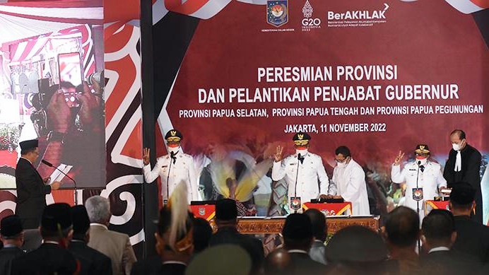 "Bismillahirrahmanirrahim, dengan rahmat Tuhan Yang Maha Esa, Jumat 11 November, saya Muhammad Tito Karnavian Mendagri atas nama Presiden, dengan ini meresmikan Provinsi Papua Selatan berdasarkan UU No 14 Tahun 2022, Provinsi Papua Tengah berdasarkan UU No 15 Tahun 2022, dan Provinsi Papua Pegunungan berdasarkan UU Nomor 16 Tahun 2022," ujar Tito.