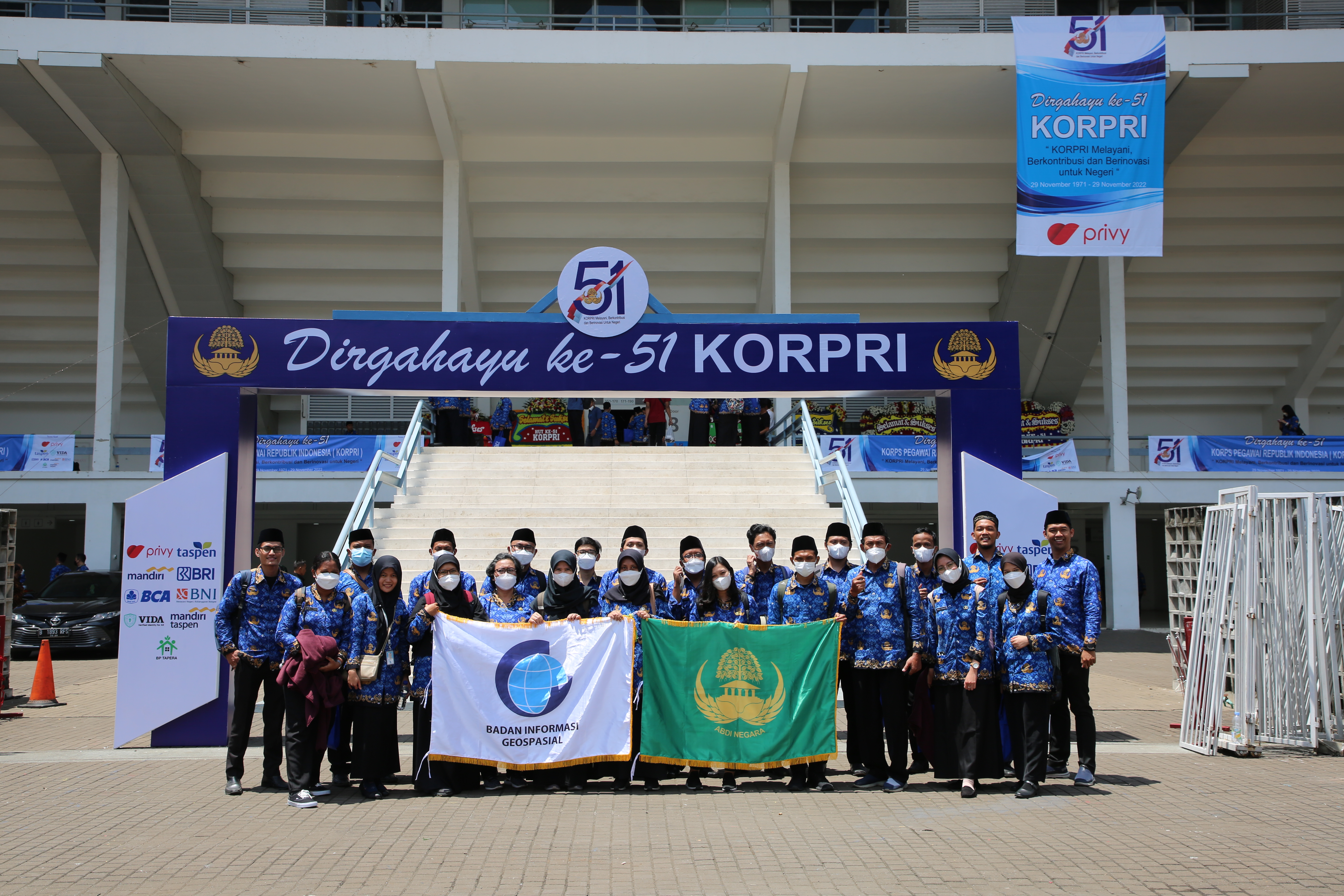 Berita Geospasial, Jakarta - Sebanyak 26 orang pegawai Badan Informasi Geospasial (BIG) menghadiri Upacara Hari Ulang Tahun Korps Pegawai Republik Indonesia (KORPRI) ke-51 yang berlangsung di Istora Senayan, Jakarta, Selasa, (29/11/2022). Upacara HUT ke-51 KORPRI ini juga diikuti para Aparatur Sipil Negara (ASN) yang mewakili masing-masing kementerian/lembaga.