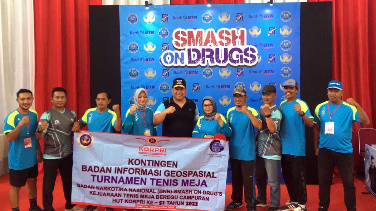 Bogor, Berita Geospasial - Dalam rangka peringatan Hari Ulang Tahun Korps Pegawai Republik Indonesia (HUT KORPRI) ke-51 Tahun 2022, Dewan Pengurus KORPRI Badan Narkotika Nasional Republik Indonesia (BNN RI) menyelenggarakan Kejuaraan Tenis Meja BNN CUP 2022. Tema yang diusung dalam kegiatan ini adalah “Melalui Olahraga Tenis Meja Mewujudkan Aparatur Sipil Negara ‘Bersinar’ (Bersih dari Penyalahgunaan Narkoba) dengan Tagline “Smash on Drugs”. Turnamen berlangsung pada 19–20 Desember 2022 bertempat di Bogor.
